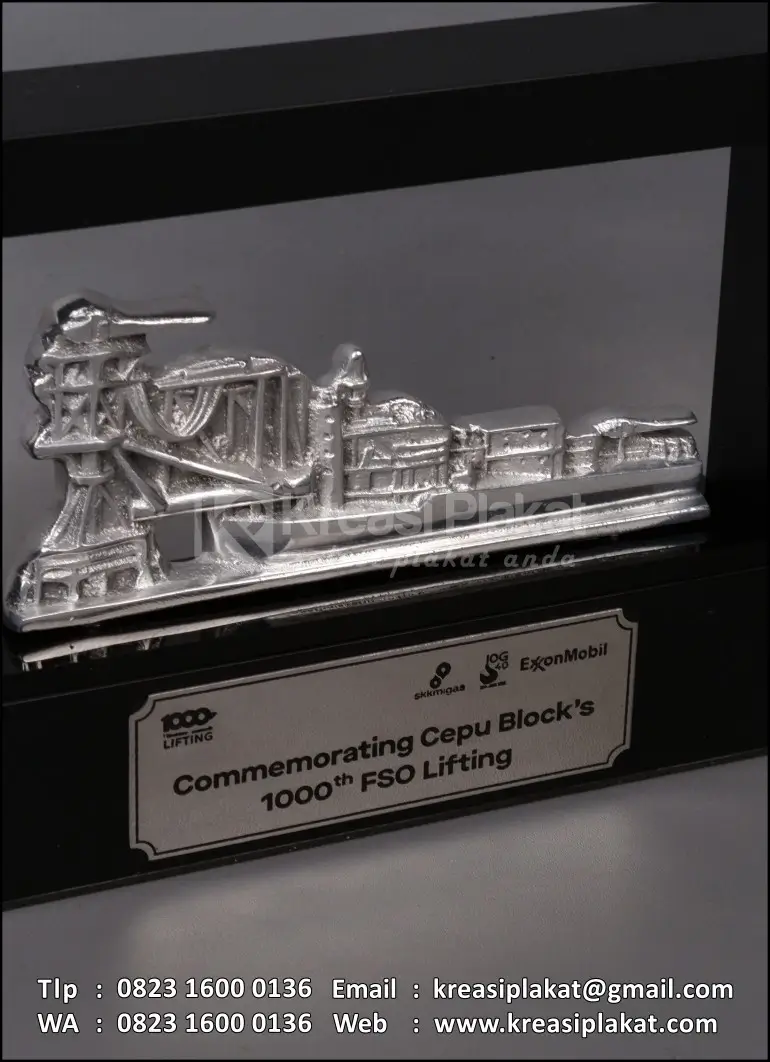 Plakat logam eksklusif ini dibuat untuk memperingati Cepu Block’s 1000th FSO Lifting, sebuah pencapaian besar dalam industri migas. Menggunakan miniatur fasilitas lifting yang dibuat detail dengan finishing silver metalik, plakat ini tampil premium dan berkelas. Frame kayu hitam doff memberikan kesan modern dan kokoh, sangat cocok sebagai simbol apresiasi untuk mitra kerja, tim proyek, maupun dokumentasi milestone perusahaan.