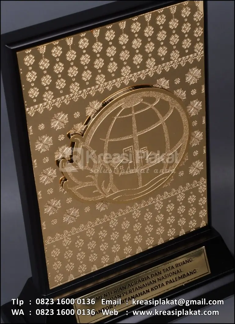 Plakat logam eksklusif ini dibuat sebagai kenang-kenangan dari Kementerian Agraria dan Tata Ruang / Badan Pertanahan Nasional – Kantor Pertanahan Kota Palembang. Mengusung dominasi warna emas dengan teknik etsa bermotif khas, plakat ini tampil mewah dan berwibawa. Logo BPN yang ditampilkan secara timbul memberikan kesan resmi dan elegan, sangat cocok digunakan sebagai simbol apresiasi maupun hadiah kedinasan yang penuh makna.